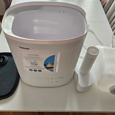 Beurer ilmankostutin sisätilojen ilmankosteuden säätelyyn. Laitteessa on musta runko ja läpinäkyvä vesisäiliö, josta kostutussumu nousee yläosasta. Sopii käytettäväksi esimerkiksi olohuoneessa tai makuuhuoneessa kuivan sisäilman helpottamiseen. Laitteessa on etupaneelissa säätörengas ja merkkivalo, joilla ohjataan toimintaa ja asetuksia. Käyttöön tarvitaan verkkovirta ja vesisäiliön säännöllinen täyttö ja puhdistus.