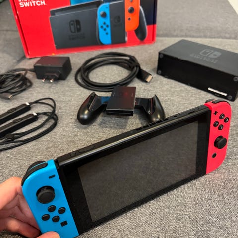 Nintendo Switch -pelikonsoli musta. Käsikonsoli, jota voidaan käyttää sekä kannettavana että telakan kautta televisioon liitettynä. Mukana näkyvissä telakka, Joy-Con -ohjaimet rannekkeineen sekä ohjainpidike.