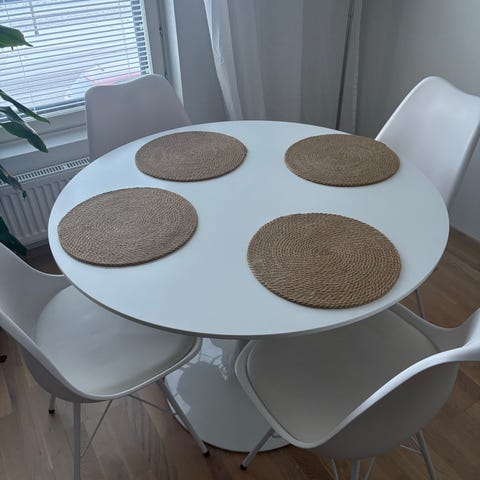 Maskun musta ruokailyryhmä pyöreällä pöydällä. Löytyy maskun sivuilta "apollo & concept black" ovh 355€. Materiaali pöytälevyssä tammiviilu, väri musta. Pieniä käytön jälkiä mutta kunto hyvä. Tuolien istuinosa keinonahkaa ja helppo putsata. En pysty kuljettamaan eli pelkkä nouto mutta melko kevyt kyllä kantaa!