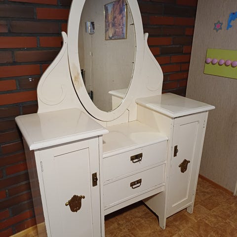 Kuvan setti.penkki kaipaa uutta päällistä mutta menee noinkin.pöydän pituus 117cm.peilin saa irti