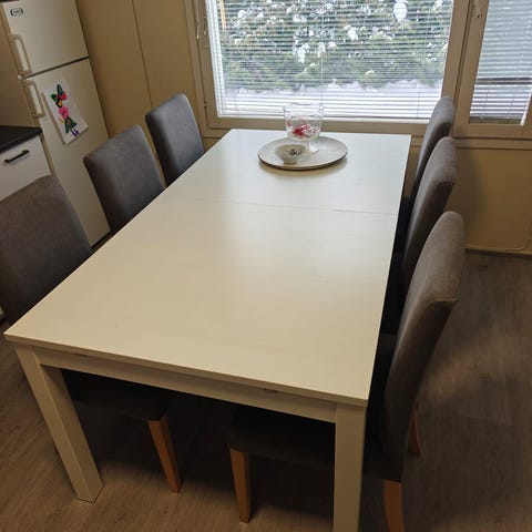 Muutossa ylimääräisenä korkeakiiltoinen pöytä ja neljä täysipuista tuolia. Löytyy hammaslahdesta tai jns keskustasta, riippuen noudon ajankohdasta. Valmiiksi purettuna.