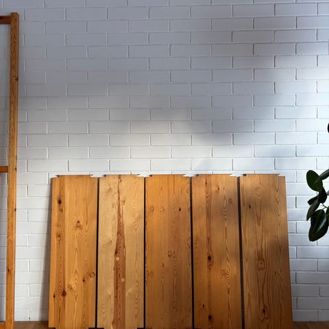 Myydään valkoiseksi maalattu Lundian hylly, jossa kaksi 220cm korkeaa osaa ja kuusi 30x100cm hyllylevyä.
