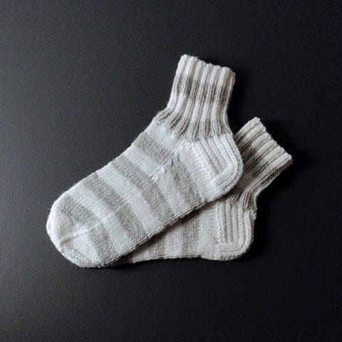 Neulottu Novitan 7 veljestä langoista (värit: karamelli, jäkälä ja valkea).
