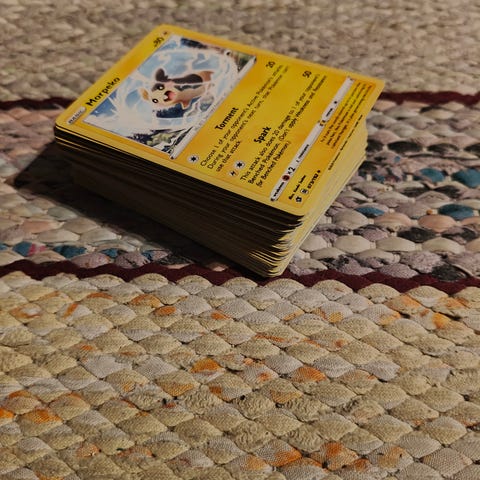 Pokémon keräilykortit, joissa useita holo- ja V-kortteja eri sarjoista. Korteissa näkyy muun muassa erilaisia Pokémon-hahmoja sekä kouluttajakortteja. Kuvat esittävät osan kokoelmasta, jossa on sekä vanhempia että uudemmista sarjoista peräisin olevia kortteja. Soveltuu Pokémon-korttien keräilyyn ja pelaamiseen. Korteissa vaihtelevat harvinaisuudet ja kuvitustyylit, mukaan lukien täyskuvakortteja ja erikoisversioita. Osta yksitellen tai useampia, sovitellaan hinta sen mukaan.