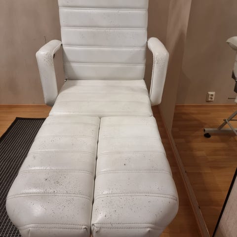 Sähköinen hoitotuoli, jossa on vaalea/valkoinen verhoilu. Tuolissa on säädettävä selkänoja, istuinosa ja jalkatuet, jotka mahdollistavat erilaiset työskentelyasennot. Käsinojat ovat pehmustetut ja ne voidaan tarvittaessa kääntää pois tieltä. Tuolia ohjataan lattialla olevalla jalkakytkimellä, jonka avulla korkeutta ja kallistusta voidaan säätää. Sopii esimerkiksi hoito-, kauneus- tai tutkimuskäyttöön tiloihin, joissa tarvitaan vakaata ja säädettävää hoitotuolia.