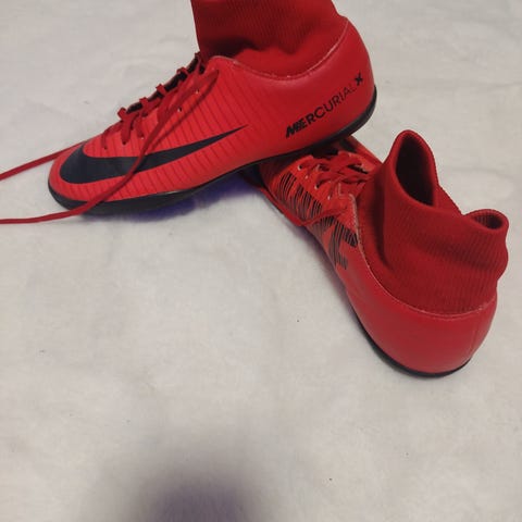 Nike Mercurial X futsalkengät. Punainen päällinen ja mustat yksityiskohdat, matala malli nauhakiinnityksellä. Pohjassa kuvioitu kumipohja, joka on suunniteltu erityisesti koville alustoille tai sisäpeleihin. Soveltuu jalkapallon ja futsalin yms sisällä pelaamiseen. Kokoa 41