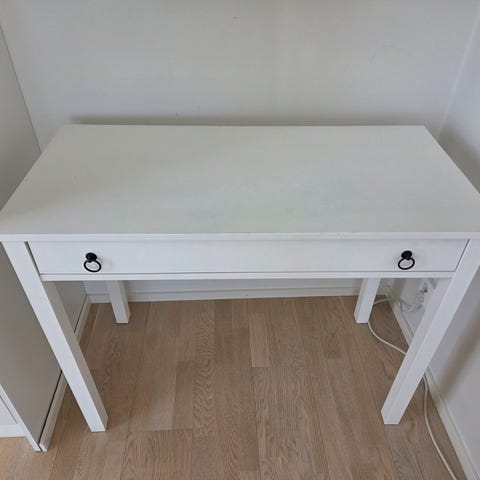 Myydään valkoinen kiiltopinnalla oleva työ-/sivupöytä jossa kaksi vetolaatikkoa. Vetolaatikoissa metalliset vetimet koko matkalta.