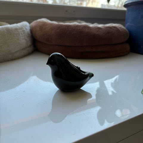 Puna-musta lintu on valmistettu Nuutajärven tehtaalla. Pohjassa ei ole kaiverrettua signeerausta.