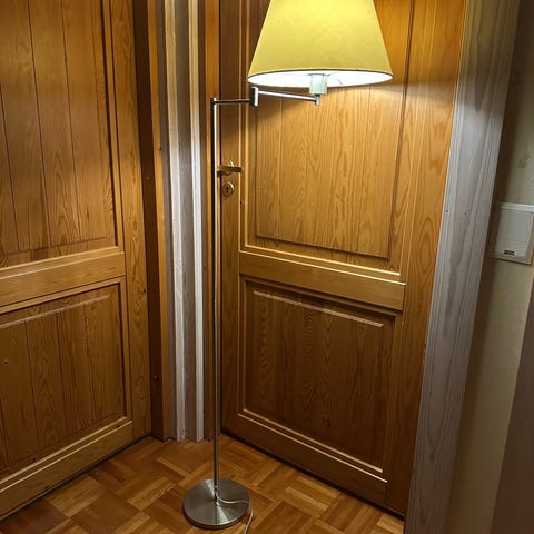 Elloksen canon lattiavalaisin. Erittäin hyvässä kunnossa. Lampun kaarevuus säädettävissä. Painava jalka, ei huoju. Ovh 249€