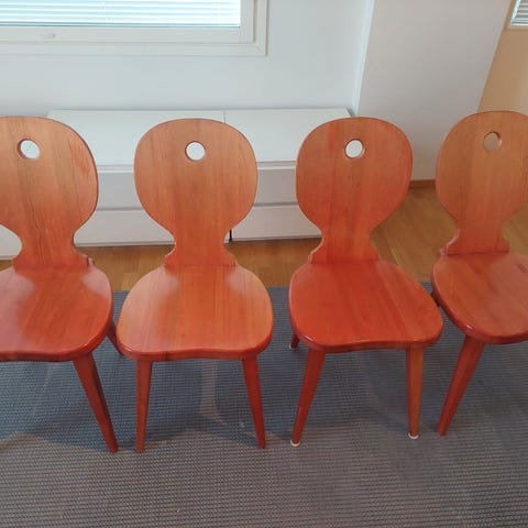 4 kpl hyväkuntoisia tuoleja. Kappalehinta 40 €, voi ostaa myös yksittäisenä. Maalittomat kohdat kuuluvat tuolin malliin, istuinosa "koripunosta", selkänojan ristikko rautaa.