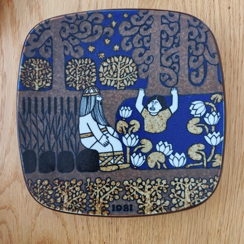 Hyväkuntoinen Arabian valmistama, Raija Uosikkisen suunnittelema Kalevala-vuosilautanen vuodelta 1983.