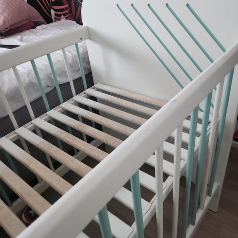 Pari vuotta sitten uutena ostettu pinnasänky, jonka saa muutettua juniorsängyksi, tätä varten mukana on laita.