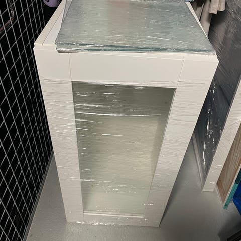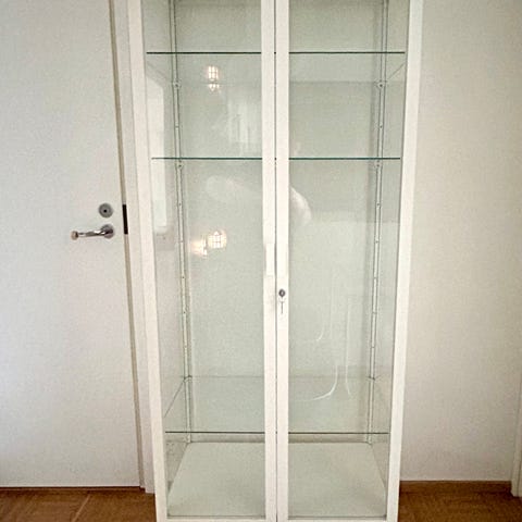 Myynnissä 3 erillistä vitriinikaappia ja avohyllykkö Ikea Magiker -sarjaa. Avohyllykön korkeus 114 cm, leveys ja syvyys samat kuin korkeissa vitriinikaapeissa. Kaksi vitriiniä laatikostolla ja yksi alakaapilla. Runko on koivunväristä kennolevyä. Tukevaa tekoa, ei notku eikä heilu.