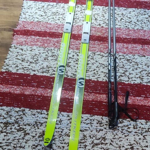 Lasten perinteisen sukset pitopohjalla 140cm ja sauvat 105cm. Sukset ovat todella hyvässä kunnossa. Meille uutena ostetut ja yhden talven hiihdetyt. Mukaan saa myös vanhat koon 34 monot, jotka käyvät siteisiin.
