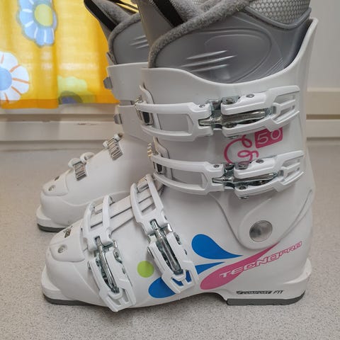 Tecno lasten laskettelumonot. Koko 240 (pohjassa merkintä 240/255). Väri valkoinen harmailla yksityiskohdilla ja koristekuvioilla. Monossa useampi solkikiristys jalan tukemiseen ja istuvuuden säätöön. Soveltuu lasten lasketteluun ja rinteessä käyttöön yhteensopivien alppisuksisiteiden kanssa. Vastaa kokoa 38-38,5.