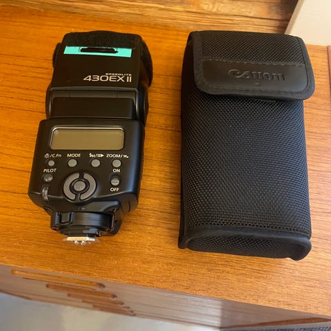 Toimiva ja hyväkuntoinen salama kuvassa näkyvine varusteineen.