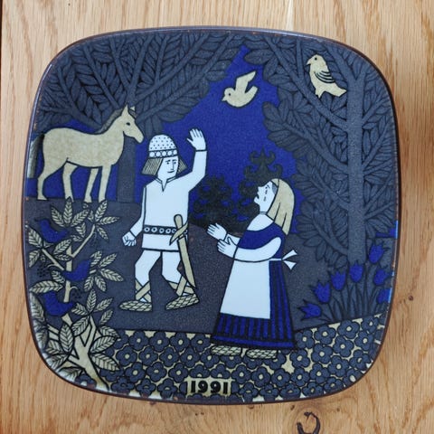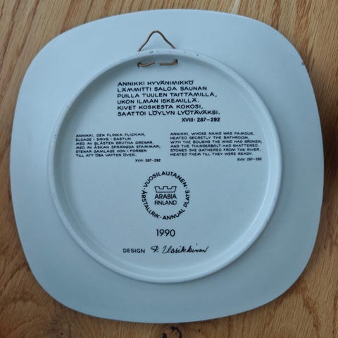 Hyväkuntoinen Arabian valmistama, Raija Uosikkisen suunnittelema Kalevala-vuosilautanen vuodelta 1987.