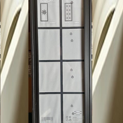 Ikea valkoinen monikehyksinen valokuvakehys, jossa useita päällekkäisiä vaakasuuntaisia kehyspaikkoja. Kehys on korkea ja kapea, sopii esimerkiksi seinälle tai nojaamaan seinää vasten. Taustapuolella on kiinnitysklipsit jokaiselle kuvalle. Soveltuu useiden valokuvien tai esimerkiksi viikonpäiväkohtaisten muistilappujen esillepanoon kodissa tai toimistossa.