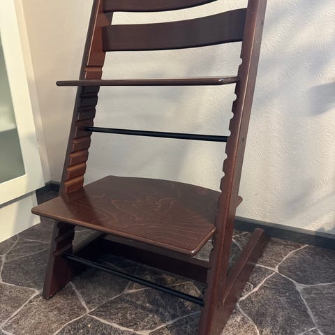 Stokke syöttötuoli, jossa musta istuinosa ja jalkatuki sekä vaaleat puujalat (white wash). Tuolissa on korkea selkänoja ja integroitu jalkatuki lapselle. Materiaalina yhdistelmä puuta ja muovia. Soveltuu lapsen ruokailu- ja istumatuoliksi pöydän ääreen. Kuvissa näkyy käytön jälkiä, kuten naarmuja istuinosassa ja kulumaa jaloissa.