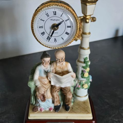 Kaunis kullanvärinen pöytäkello. Tämä on muovia. Patterikansi puuttuu. Korkeus noin 23cm. Kellon tikitys ei ole tasaista.
