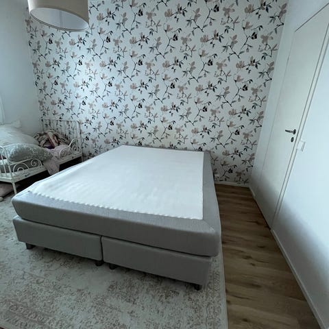 Jysk sänky harmaalla kangasverhoillulla rungolla. Sängyssä on pehmustettu ja napitettu 83cm korkea pääty sekä puiset jalat. Mukana tulee sälepohja. Sopii kahden hengen sängyksi. Korkeus jalkojen kanssa 37,5. Neutraali harmaa väri ja pelkistetty muotoilu sopivat monenlaiseen makuuhuoneeseen.