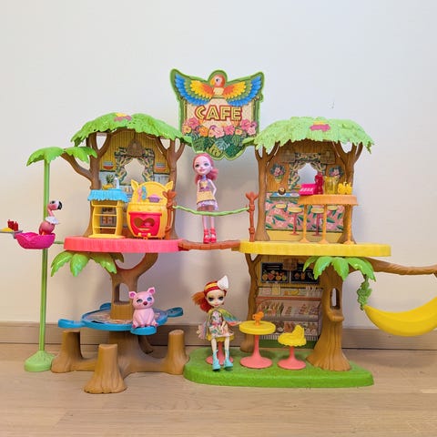 Kiva ja turvallinen leikkikahvila ja hahmot taaperolle. Kahvilan ovi aukeaa napista painamalla. Kirahvi ei alunperin kuulu settiin, mutta on samaa sarjaa.