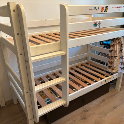 Lasten valkoinen Huxie kerrossänky, jossa on kestävät puiset sälepohjat. Kerrossänky on erotettavissa myös kahdeksi erilliseksi sängyksi (ks kuva kolme). Huomioithan, että erilliset sängyt eivät ole samanlaisia. Sekä ylä- että alasängyssä on turvalaidat