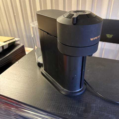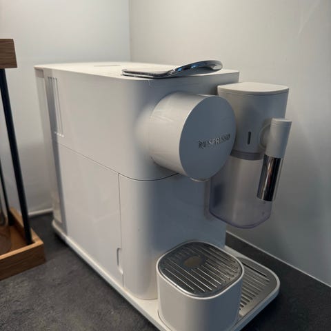 Nespresso kapselikeitin valkoisena. Laite käyttää Nespresso-kapseleita, jotka asetetaan yläosaan. Edessä on tippakaukalo ja ritilä kupille sekä sivussa irrotettava vesisäiliö. Mukana näkyy kapselilaatikko, jossa on useita erilaisia Nespresso-kapseleita. Sopii espresson ja muiden kahvijuomien valmistukseen Nespresso-kapseleilla kotikäytössä. Mukana suomenkielinen käyttö ohje. Kaipaa uutta keittäjää, koska meille tulossa kahvikone.