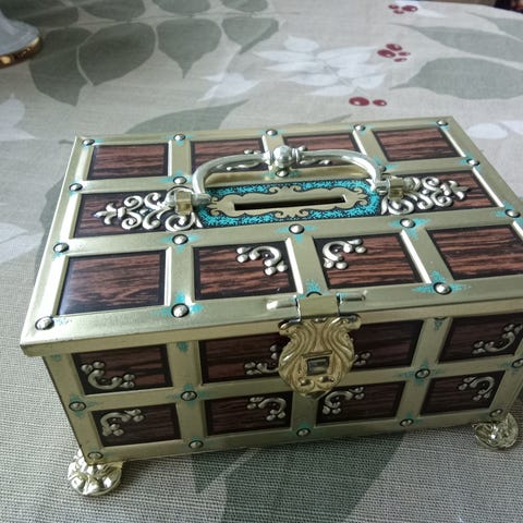 Hellas lippaanmuotoinen säilytyslaatikko. Punainen metallipintainen laatikko, jossa kullanväriset reunat, koristekahva ja kohokuvioidut koristeet sivuilla. Sisäpinta on sileää metallia. Sopii pienten esineiden, kuten korujen, kolikoiden tai muistoesineiden säilyttämiseen. Valmistaja Hellas, Turku / Åbo, Finland, tuotetiedot merkitty pohjassa olevaan etikettiin.