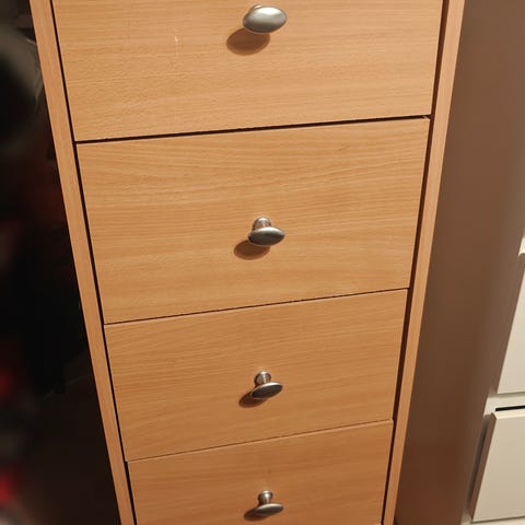 Annetaan lipasto. Mitat näkyy Ikean sivuilta lainatussa kuvassa. Siisti, jotain ihan pieniä jälkiä. Yksi vedin puuttuu, uuden saa itse laitettua tilalle.