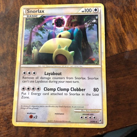 Pokémon Snorlax keräilykortti. Kortti on englanninkielinen ja siinä on 130 HP. Kortissa on kyky Ability: Immunity sekä hyökkäys Body Slam, joka tekee 50 vahinkoa. Kortin taustapuolella on perinteinen sininen Pokémon-korttien takakansi poképallokuvalla. Soveltuu Pokémon-korttikokoelmaan tai pelaamiseen Pokémon Trading Card Game -pelissä.
