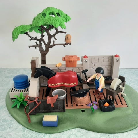 Vintage Playmobil 3439 ponitalli muokattuna kuvissa näkyvillä osilla. Lisänä settiin saa tallin takana olevat härkävankkurit.