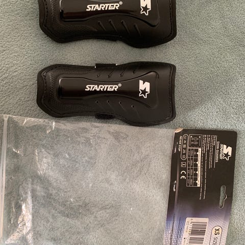 Lasten Starter-merkkiset säärisuojat. Suojissa kovamuovinen edusta ja kiinteä nilkkasuojus. Koko XS, sopii hyvin esim. aloittavalle 4-6 -vuotiaalle.