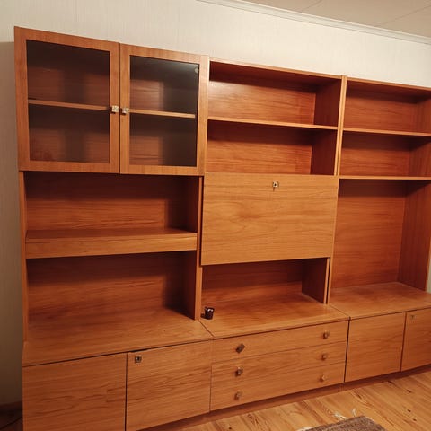 Tamminen, kätevästi kasattava kirjahylly, jossa yhteen hyllyyn lasiovet ja kahteen vaneriovet (valkoiset). Hylly muuten hyvässä kunnossa, mutta ylimmän hyllyn yläpinnassa kuivuneita kosteusvauriota, vaneriovet kuluneet. Tyylikäs ja myotokieleltään selkeä 60-70 luvun hyllykkö. Purettuna menee pieneen tilaan. Viimeisessä kuvassa ylin hylly pois, jolloin oikein siisti. Tällöin korkeus 133 cm.