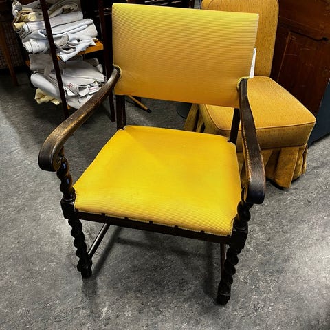 Nahkaverhoiltu puinen nojatuoli nahkaisella istuimella ja selkänojalla. Tuolissa on puiset käsinojat ja jalat sekä koristeellinen selkänojan keskiosa. Istuimessa näkyy kulumaa ja paikallinen vaurio muttei ole kuitenkaan puhki.