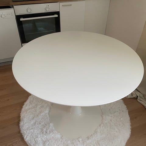 Pyöreä ruokapöytä, jossa on valkoinen MDF-pöytälevy ja yhteensopiva teräsrunko. Ø100 x K75 cm.
