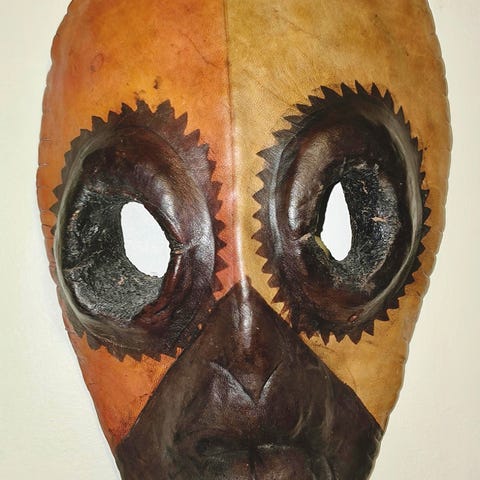 Keräilykohde tai arvokas sisustuselementti. Maskissa on kiinnitysnaru seinälle ripustamista varten.