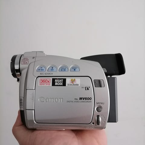 Canon MV400 videokamera. Digitaalinen videokamera, jossa sivussa näyttöpaneeli ja liitäntöjä kaapeleille. Kuvissa näkyy mukana erilaisia johtoja ja virtalähde. Sopii videokuvaukseen ja vanhojen nauhojen katseluun tai siirtämiseen, kun yhteensopivat kasetit ja lisävarusteet ovat käytettävissä.