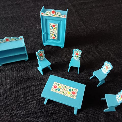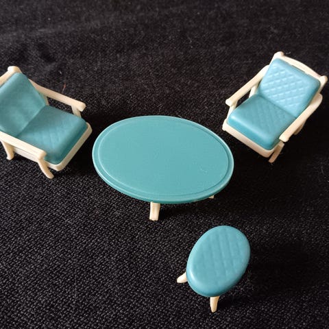 Loistokuntoinen nukkekodin sohvakalusto 50-60 luvulta. Ovat ehjät ja todella siistit. Mitat: sohva 14,5 x 7 x 5,5 cm, tuolit 9,5 x 8 x 5,5 cm, pöydän halkaisija 9 cm korkeus 5,5 cm.