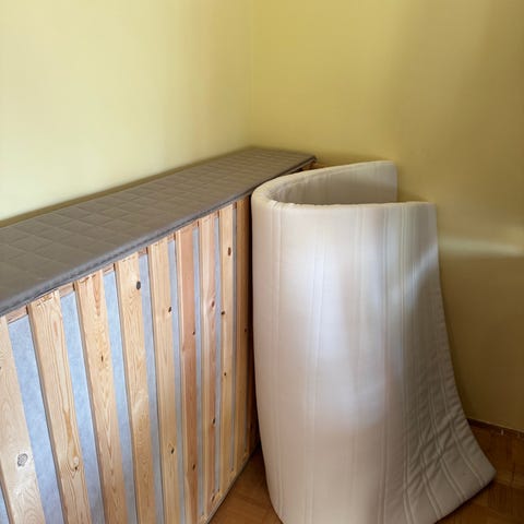 Mukana tulee viimeisessä kuvassa näkyvä sijauspatja. Sijauspatjan korkeus on noin 8 cm ja se on ostettu aikanaan Askosta.