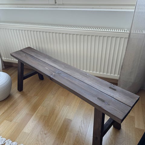 Upea käsintehty puinen penkki. Mäntyä. Lakattu kahteen kertaan. Pituus 124cm, korkeus noin 45cm, lev 22cm. Istuinlankun paksuus 4cm. Jykevää tekoa. Kestää 2-3ihmisen painon istua.