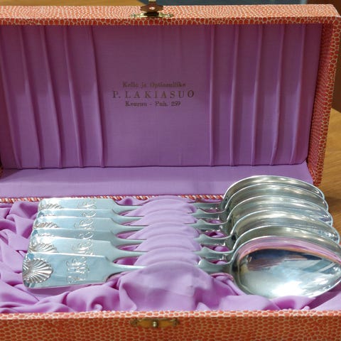Lusikoita on käytetty, mutta ovat siistissä kunnossa. Lusikat alkuperäisessä rasiassa.