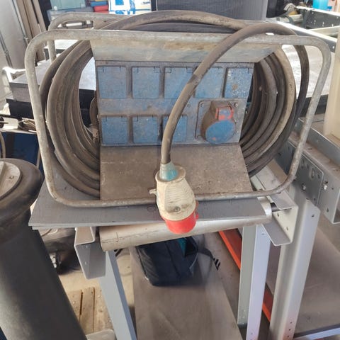 Siirrettävä 16A sähkökeskus, jossa useita pistorasioita ja kiinteä 5 m jatkokaapeli. Soveltuu esimerkiksi työmaa- ja remonttikäyttöön tai tilapäiseen sähkönjakeluun. Rungossa kantokahvat helpottamassa siirtämistä ja suojaamassa pistorasioita. Pistorasiat ja liittimet on sijoitettu keskuksen etupuolelle helppoa kytkentää varten. Ulkoisesti elämää nähnyt, mutta ei nämä näyttelyesineitä olekaan. Toisesta 16A rasiasta puuttuu läppäkansi.