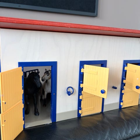 Schleich hevostalli leikkitalli. Muovinen tallirakennus, jossa on useita karsinoita. Karsinoiden ulko ovien viereen saa laitettua aidat kiinni. Mukana tulee kuvassa olevat tavarat mukaan. Ei paljoa käytönjälkiä. NOUTO AKAASTA!