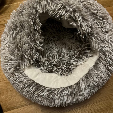 Myydään koiran tai kissan peti, jossa pehmeä harmaa karvavuori ja vaalea sisäpinta. Irroitettava tyyny. Tyynyä paikattu kerran.