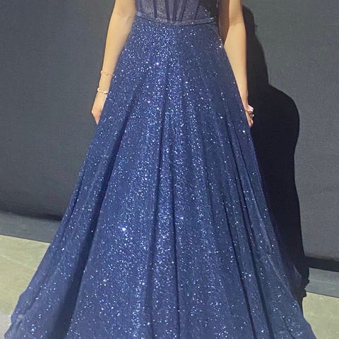 Kaunis syvän tummansininen kimalteleva vanhojentanssimekko, koko xxs/32.