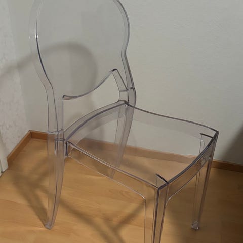 Kirkas muovituoli, ostettu joskus Etolasta. Muuten oikein siisti, istuinosassa on naarmuja, joita ei kuitenkaan huomaa ellei tosi läheltä katso.
