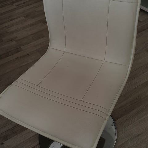 Valkoiset ruokapöydän tuolit. Meillä ollut myös kirjoituspöydän tuoleina. Jalat puun väriset. Istuinosa valkeaa keinonahkaa. Myynnissä 2 kpl tuoleja.