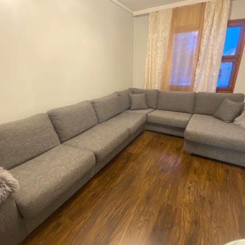 Harmaa kulmasohva, harma tasapintainen kangas. Sohvassa on useita istumapaikkoja ja U-mallinen kulmarakenne, joka sopii olohuoneen nurkkaan. Selkänojissa on irtotyynyt ja istuinosat muodostavat yhtenäisen istuinpinnan. Sohva soveltuu useamman henkilön oleskeluun ja rentoutumiseen. Väri on neutraali harmaa, joka on helppo yhdistää erilaisiin sisustustyyleihin.