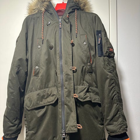Superdry Everest miesten talvitakki, koko XL. Punainen talvitakki, valmistettu polyesteristä. Takissa on huppu, jossa tekoturkisreunus, sekä joustoresorit helmassa ja hihansuissa. Edessä on vetoketju- ja nepparikiinnitys sekä useita taskuja. Sisäpuolella on pehmeä vuori. Hihassa Superdry Everest -merkki.